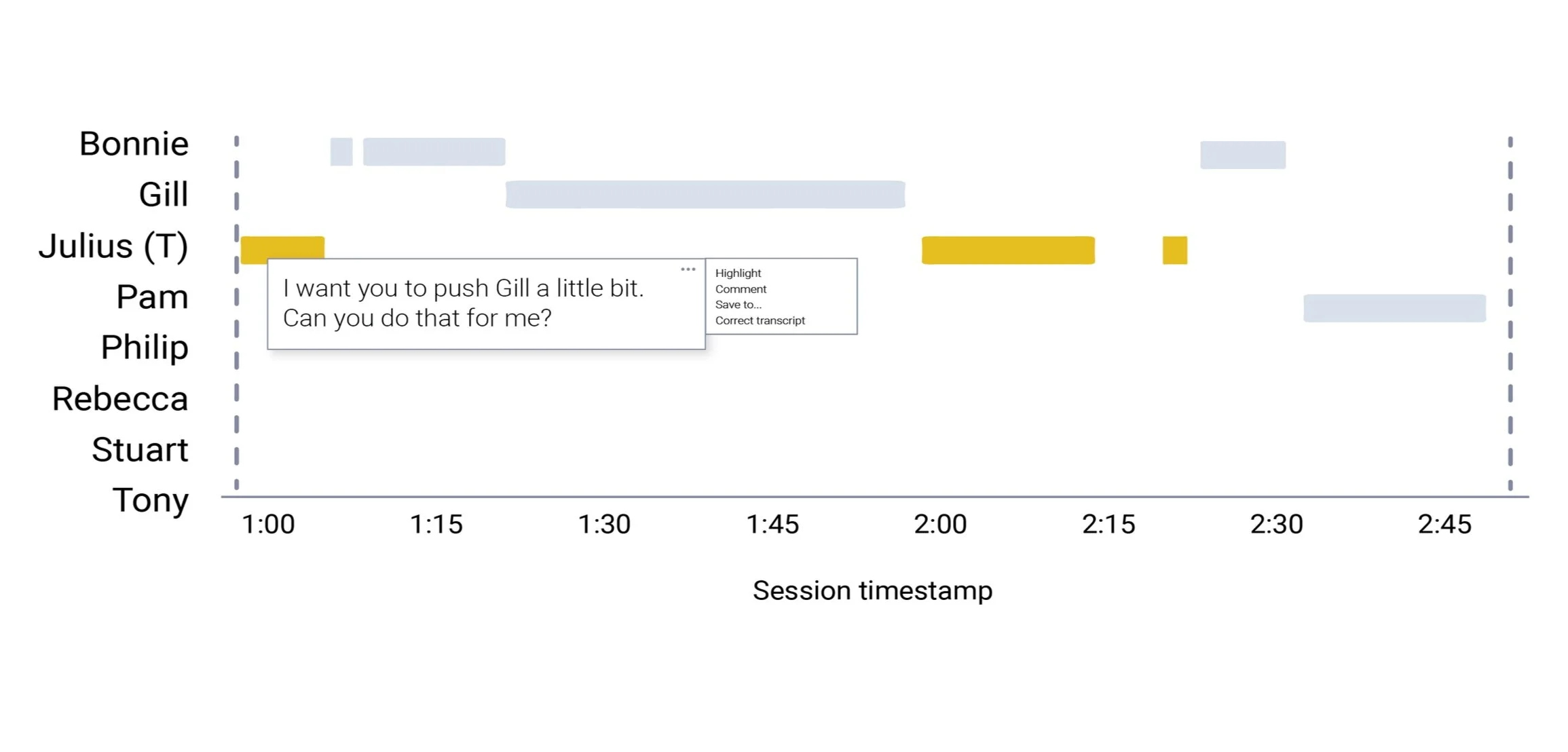 (Above) Possibilities for visualizing speaker activity during a session.